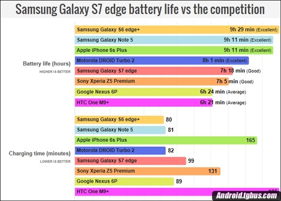 三星S7 Edge續航的表現基本上與Galaxy S7差不多,大約為7小時18分鐘,相比之下,前任Galaxy S6 Edge的表現為9小時29分鐘,另外後者的電池也僅有3000mAh。