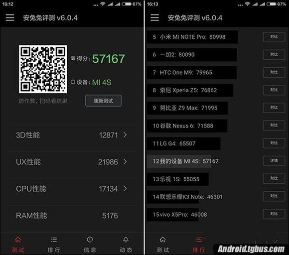 從測試來看,小米4安兔兔跑分5.7萬分,屬於中高端安卓機的跑分水准,性能表現還是很不錯的,足夠應付各類大型應用與游戲。