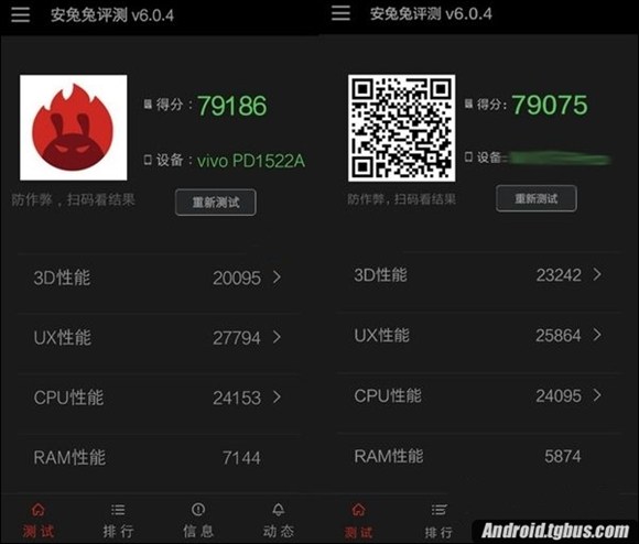 而在跑分上,vivo Xplay5在安兔兔6.0最新版測試得到了79000+分數水准,整體性能跑分算是不錯的。