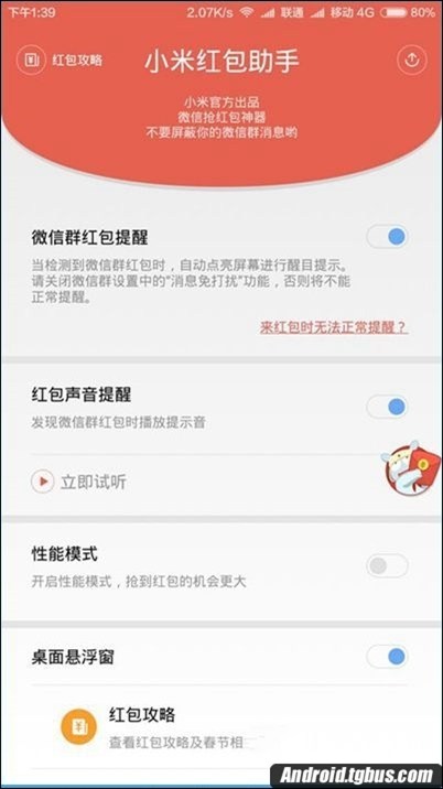 首先,小米紅包助手並不是作弊插件,主要提供紅包提醒功能,具體來講:熄屏狀態下,有紅包出現時,手機會發出“紅包來了”的聲音提醒,同時點亮手機屏幕並將紅包信息以彈窗形式展現。