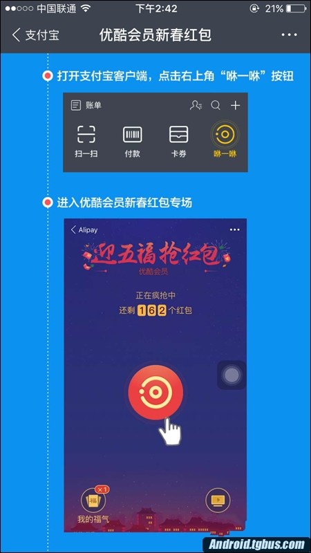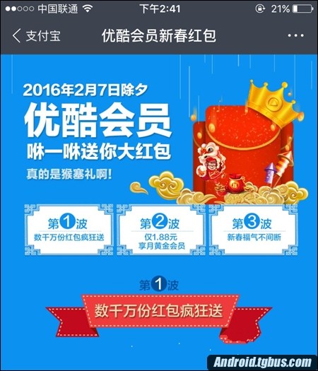 首先我們得找到優酷會員新春紅包入口位置,我們打開支付寶,在滾動窗口即可找到入口位置,如下圖所示: