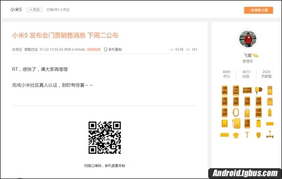 今天小米社區管理員宣布,小米5發布會門票銷售消息將在下周二公布,屆時肯定也會宣布小米5發布會的具體時間,會不會之前猜測的2月22日呢?