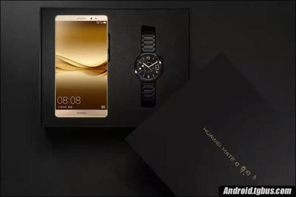 與常規版本不同的是,這個Mate 8尊爵版采用了更高檔的包裝盒,其中含有Mate 8(4GB RAM+128GB ROM)手機和HUAWEI Watch尊享版各一部。