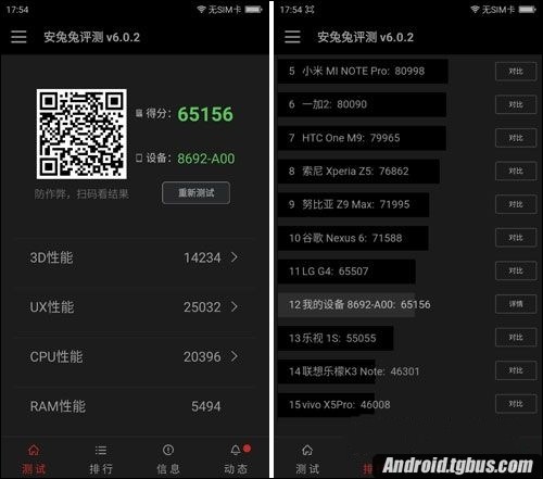 通過安兔兔V6.0.2跑分軟件測試我們可以看出,360手機極客版跑分為65156分,超過了6.5萬分。就性能層面而言,360手機極客版整體表現還是不俗的,在安卓陣營中屬於高端機水平了。
