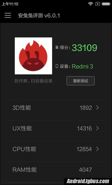 紅米3安兔兔跑分成績介紹