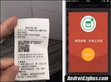 二、營業員沒有直接找現鈔,而是打印出一張”微信找零小票“,上面印有二維碼以及找零金額,小編打開微信掃描小票上的二維碼,彈出了一個1元的“微信紅包”。