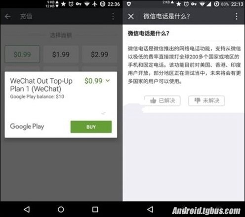 費用方面,點擊充值按鈕會彈出Google Play充值界面,打往中國的主叫電話資費為每0.99美元110分鐘,折合人民幣約為6分錢每分鐘,非常劃算。