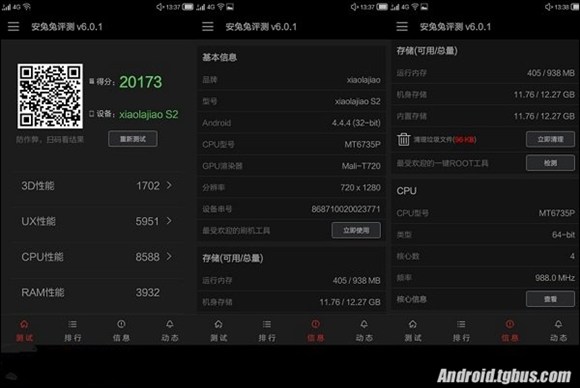 通過安兔兔跑分測試來看,小辣椒S2安兔兔跑分約為20173分,屬於入門安卓機跑分水准,性能確實一般。