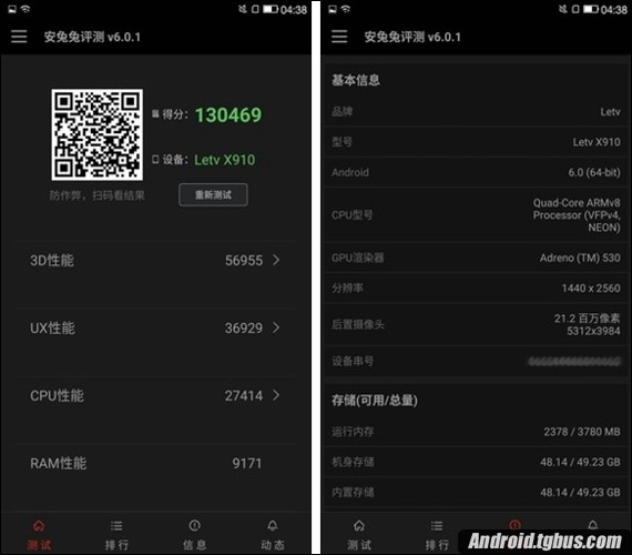 通過測試,樂視Max Pro安兔兔跑分成績為130469分,而正式零售版機型經過優化後可能還會進一步提高,如此高的跑分成績確實讓人非常震撼。