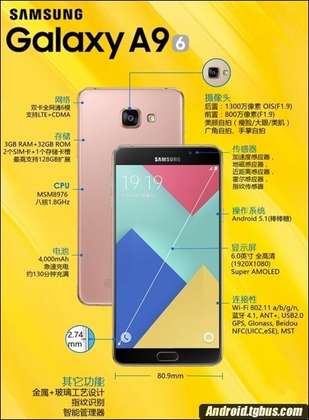 首先在配置方面,三星A9采用6英寸1080p Super AMOLED顯示屏,搭載骁龍652八核64位處理器(全球首發),內置3GB內存和32GB機身存儲空間,提供一顆800萬像素前置攝像頭和一顆1300萬像素後置攝像頭,電池容量4000mAh,支持快速充電以及雙卡雙待全網通。