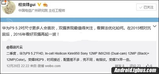 目前有網友曝光了華為P9的詳細配置,據悉華為P9將采用5.2英寸1080p屏幕,搭載自家的海思麒麟950八核處理器處理器。采用後置雙攝像頭,這也是該機最大的亮點。且均是來自索尼的1300萬像素攝像頭,兩顆攝像頭都是1300萬像素,一顆負責色彩,一顆負責黑白(輪廓)。搭配4GB內存和/32GB64GB存儲內存,運行運行Android 6.0系統。