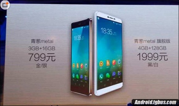 對比型號 青蔥metal旗艦版 青蔥metal(標准版) 屏幕尺寸 6英寸 5.5英寸 屏幕分辨率 2560x1440像素 490PPI 1920x1080分辨率 401ppi CPU型號 高通骁龍810八核 聯發科八核(估計是MT6753) 運行內存 4GB DDR3 3GB DDR3 機身存儲 128GB(最大支持128G擴展) 16GB(最大支持128G擴展) 拍照規格 前置800萬+後置1600萬像素 前置800萬像素+後置1300萬像素 電池容量 5100mAh 3050mAh 系統版本 Cong OS(基於Android 5.1) Cong OS(基於Android 5.1) 網絡制式 4G全網通(雙卡雙待) 移動/聯通雙4G(雙卡雙待) 機身尺寸 不詳 150x76x8.55mm 機身顏色 黑色,白色 金色,銀色 特色功能 指紋識別、金屬機身、2.5D弧形玻璃 金屬機身,指紋識別 參考價格 1999元 799元