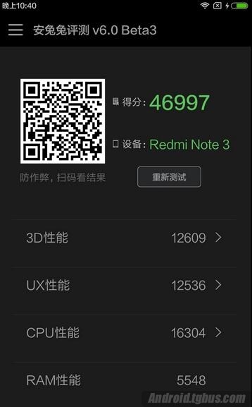 跑分是處於充電狀態,電量約為70%左右,最終成績為46997(安兔兔6.0 Beta 3),並不是很給力,但也算是MT6795處理器的正常表現了。