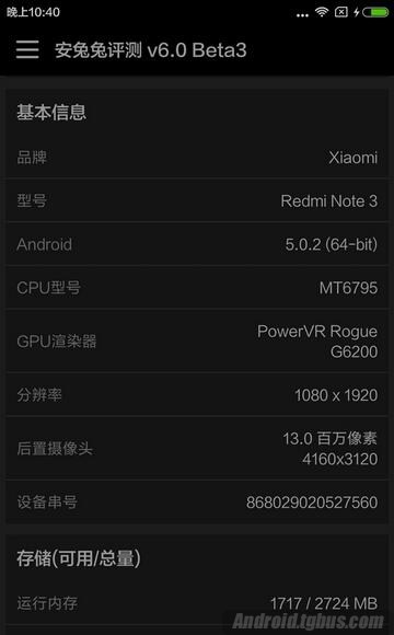 【安卓中文網】紅米Note 3采用5.5英寸1080p屏幕,搭載了Helio X10處理器,系統為MIUI7,支持雙卡雙待,不支持電信。那麼,紅米Note3安兔兔跑分多少?下面咱們來看看關於跑分的詳細介紹。