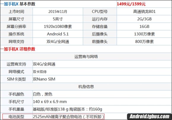 想要知道該機的電池可以拆卸嗎,我們先一起來看看該機的基本配置信息吧。一加手機X采用5.5英寸1080P AMOLED屏,前置800萬像素攝像頭,後置1300萬像素主攝像頭,主攝像頭支持PDAF相位對焦和中置馬達,以及雙ISP處理器,對焦時間達到0.25s;高通骁龍801四核處理器;輔以3GB內存和16GB存儲空間,運行基於Android 5.1.1的氫OS,支持雙卡雙待,該機電池容量為2500mAh。