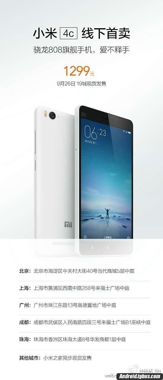 據悉,小米4c已於9月23日正式開賣,有白、灰、黃、藍、粉5種機身顏色可選。2GB內存+16GB機身存儲空間版本售價1299元,3GB內存+32GB機身存儲空間版本售價則是1499元。而為了滿足更多用戶們的需求,9月26日小米拿出一小部分小米4C,在北京、上海、廣州、成都、珠海五個城市的商場現貨開賣,價格同樣是1299元起。