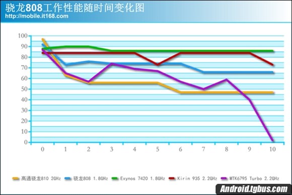 2)在滿負荷壓力測試狀態下,性能下滑由高到底為聯發科MT6795>骁龍810>骁龍808>麒麟935>三星Exynos7420。