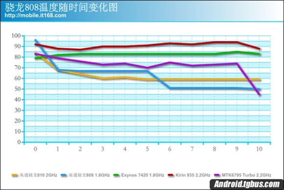 1)在滿負荷運轉狀態下,發熱量由高到底依次為麒麟935>三星Exynos7420>聯發科MT6795>高通骁龍808>高通骁龍810。
