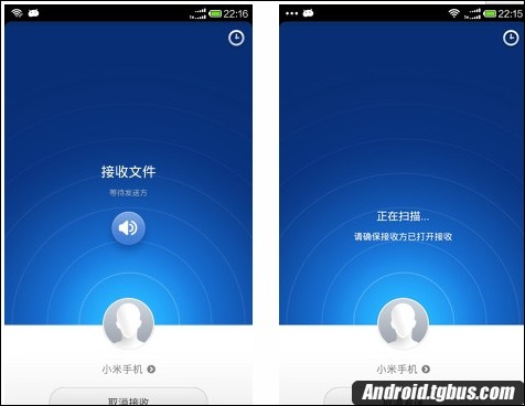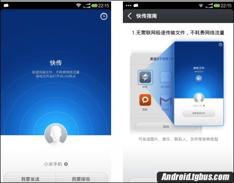 以前的MIUI版本中是有這個功能的,後來更新完就消失了,你可以自己下載小米快傳進行使用的哦。小米快傳實現了手機之間零流量快速傳輸文件(平均傳輸速度為5MB/S)。在操作上比較簡單,具體如下:
