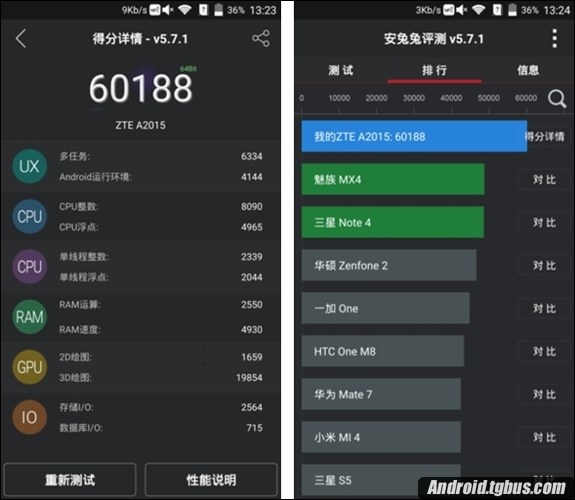 中興AXON搭載了2.2Ghz高主頻高通骁龍810八核處理器,3GB/4GB運行內存和32GB/128GB存儲空間組合;而中興AXON mini搭載的是高通曉龍616 64位八核處理器,運行3GB內存和16GB存儲空間組合。就性能來說,中興AXON定位高端,屬於旗艦機,而中興AXON mini則定位中端主流。
