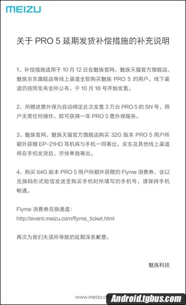 而對於這一次的延期發貨,很多煤油表達了不滿,魅族也一再致歉,並給出了相應的補償措施。在發布致歉信之後,魅族昨晚又通過官方微博對補償措施進行了補償說明。