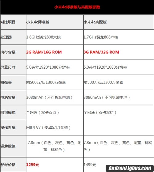 想要知道小米4c高配版多了什麼配置其實很簡單,我們可以把它和標配版之間的配置進行對比就能一目了然了。