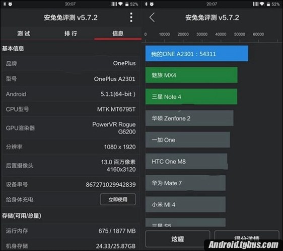 至於一加手機青春版跑分情況,通過安兔兔5.7.2版本測試得知,一加手機青春版安兔兔跑分成績為54311分,此外我們會發現其性能遠遠超過了去年的全球性能排名第一的魅族MX4,可見它的性能也是不容小觑的。