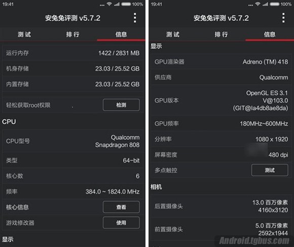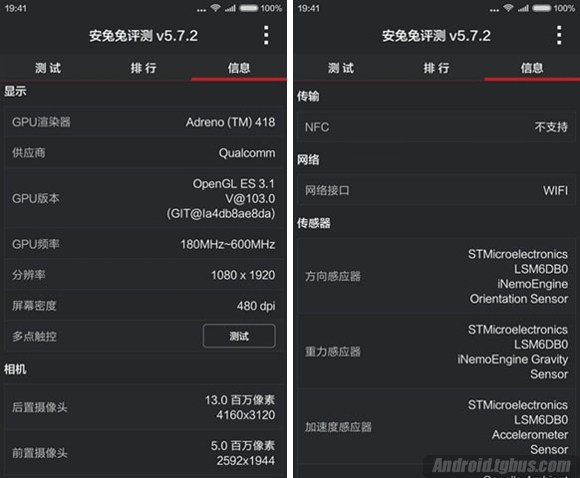 小米4c高配版采用5英寸1080P全高清屏幕,搭載1.7Ghz高通808六核處理器,運行3GB內存以及32GB存儲空間組合,擁有前置500萬像素攝像頭+後置攝像頭為1300萬像素攝像頭,電池內置3080mAh容量,運行基於Android 5.1.1的MIUI7系統,支持雙卡雙待全網通和紅外遙控器。通過大家最為熟悉的安兔兔V5.7.2版本測試跑分成績如下: