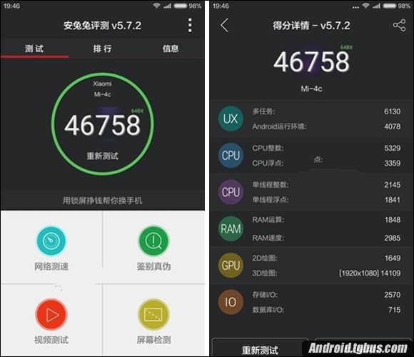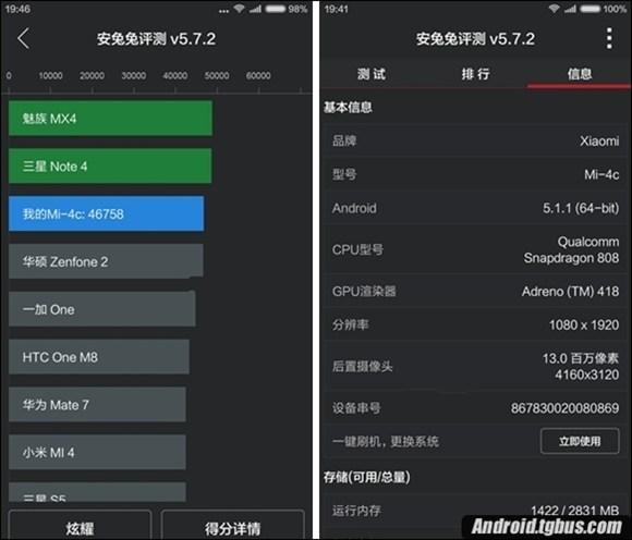 通過安兔兔跑分軟件測試來看,小米4C安兔兔跑分成績達到了46758分,這樣的跑分性能是強於骁龍801處理器以及和MT6795的成績接近,如下圖所示: