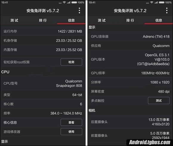 在測試小米4C跑分之前,我們先來大致看看其硬件配置。小米4C高配版采用5英寸1080P全高清屏幕,搭載1.7Ghz高通808六核處理器,運行3GB內存以及32GB存儲空間組合,擁有前置500萬像素攝像頭+後置攝像頭為1300萬像素攝像頭,電池內置3080mAh容量,運行基於Android 5.1.1的MIUI7系統,支持雙卡雙待全網通和紅外遙控器。通過大家最為熟悉的安兔兔V5.7.2版本測試跑分成績如下: