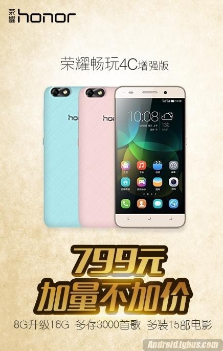 華為榮耀4C增強版即將於15日上市的消息讓不少用戶狠狠激動了一把,不過當時並未公布售價。現如今,華為榮耀4C價格正式公布,依然799元,加量不加價!