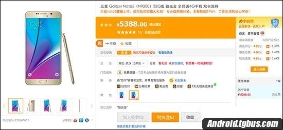 按照蘇寧給出的頁面信息顯示,32GB版本GALAXY Note 5在國內市場的價格為人民幣5388元,這樣的售價要比同容量的S6 Edge+便宜了足足500元。由於目前還未在三星官網上看到任何關於GALAXY Note 5行貨版本的售價信息,所以這次蘇寧應該屬於無意的洩露。