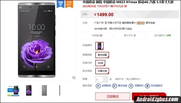 據悉,定位更高的N1 Max正式在中國移動天貓官方商城開售,從名字也能看出,該機主打大屏,售價1499元。成功購買前100台用戶,還贈送100元話費。
