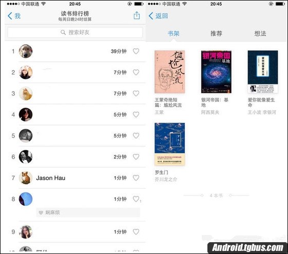 比如來說,基於微信的真實社交關系,你可以在微信讀書裡看到好友們的閱讀排名、給他們點贊;點擊某個好友的頭像之後你還能看到他的書架、推薦的書籍以及讀書時的想法。