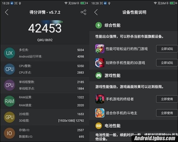 從跑分上看,360奇酷手機旗艦版在跑分上,要比青春版高出1萬多分,性能差距還是比較大的,旗艦版的性能可以滿足各類大型游戲需求。
