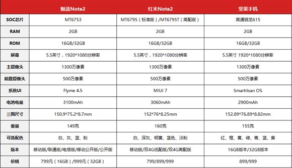 堅果手機、紅米Note2、魅藍Note2對比: