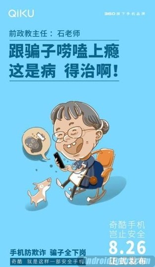 奇酷手機官方微博發布了9張漫畫圖。該海報以漫畫的方式分別體現了奇酷手機安全特性,表明即將在8月26日發布的奇酷手機將在安全上大做文章。其中最明顯的一張就是一位坐在搖椅上的老奶奶正在用手機高興地與疑似打詐騙電話的騙子對話,從老奶奶的表情上看,對於騙徒的電話並未露出任何厭惡或害怕的深情。文字配以“跟騙子唠嗑,這是病,得治!”和“手機防詐騙,騙子全下崗”,表明在使用奇酷手機的時候,不用為接到詐騙電話、騷擾短信等詐騙手段而困擾。
