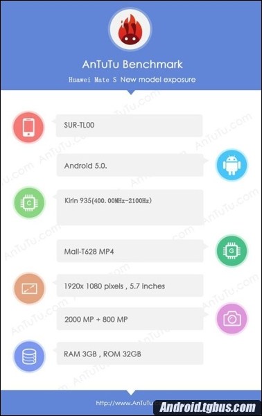 現在,安兔兔在其後台數據庫中發現了一款型號為SUR-TL00的華為新機,其配備麒麟935處理器、采用1080p顯示屏,內置3GB內存和32GB機身存儲空間,提供一顆800萬像素前置攝像頭和一顆2000萬像素後置攝像頭,運行Android 5.0系統。
