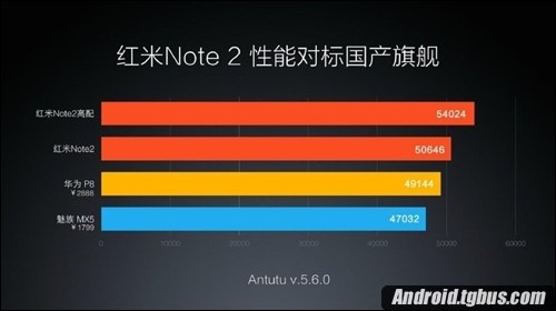 在配置方面,紅米Note2配備了5.5英寸1080P屏幕,內置MTK年度旗艦處理器,Helio X10八核64位A53架構;擁有2GB大內存+16GB/32GB存儲,3060mAh大容量可換式電池;同時配備了全新的MIUI 7系統,跑分高達54024(這是高配版的成績)。從以下的圖片我們可以看到,紅米Note2跑分完勝國產旗艦,當然也少不了它的勁敵——魅族MX5了。