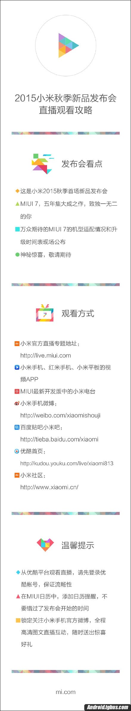 另外,在這裡巴士小編還提醒大家,請不要打開多個直播頁面,更占直播帶寬,本次直播將於今天14:00正式開始。請保證自己有個良好的上網環境,沒有條件觀看視頻直播的用戶們還可以關注“小米手機”“小米公司”、“MIUI”官方微博帳號觀看圖文直播。