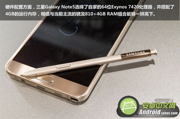 我們先來看一下三星Note5的配置參數,該機采用5.7英寸的2K分辨率屏幕,屏幕PPI達到了518。搭載三星自家的14nm八核Exynos7420處理器,其中4枚大核2.1GHz、4枚小核1.5GHz。擁有4GB LPDDR4大內存、以及32GB/64GB的機身存儲空間。攝像頭方面,該機采用了1600萬像素、F1.9大光圈的後置攝像頭,支持光學防抖功能,前置攝像頭為500萬像素,同樣是F1.9大光圈。電池容量為3000mAh,運行Android 5.1系統,支持無線快速充電、按壓式的指紋解鎖功能等。