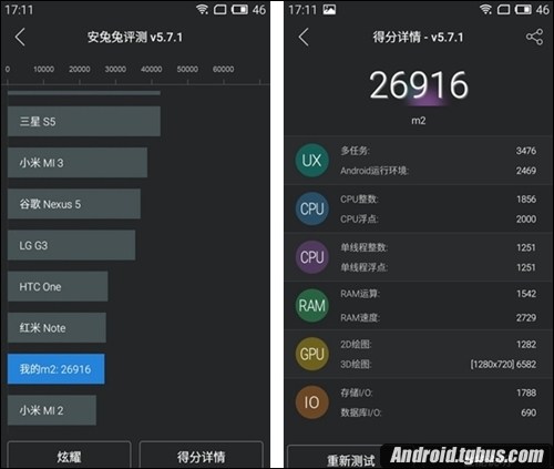 從安兔兔的跑分數據中可以看出,魅藍2要比紅米2高接近7000分,30%的差距讓魅藍2更具性價比。