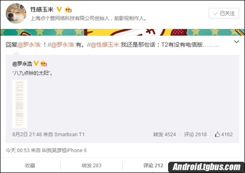 8月2日羅永浩發布長微博,表示賣手機也就是賣情懷,不過對於這篇文章,更多用戶更關心是T2手機什麼時候亮相,對此羅永浩也是給出了一些答案,其表示T2不顧死活地挑戰並突破了手機工程上的一個重大難題,但非常非常難做,想要這款手機的朋友還要在等等。