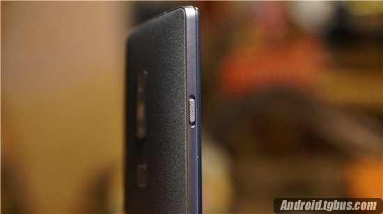 同時,相比一代,一加手機2背部的攝像頭略微下移,同時閃光燈放在了攝像頭上方,攝像頭下方則是激光對焦模塊。同時一加經典的Logo位於機身中部附近。