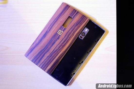相比一代,一加手機2背部的攝像頭略微下移,同時閃光燈放在了攝像頭上方,攝像頭下方則是激光對焦模塊。同時一加經典的Logo位於機身中部附近。