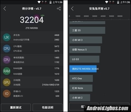 至於中興威武3的跑分,通過過最新版安兔兔跑分軟件進行跑分測試,中心威武3安兔兔跑分成績為32204分,介於目前大多數搭載骁龍615的機型跑分均在30000分以裡。但是光看跑分是不能比較中興威武3性能的,對於跑分僅僅作為一項性能參考指標即可。