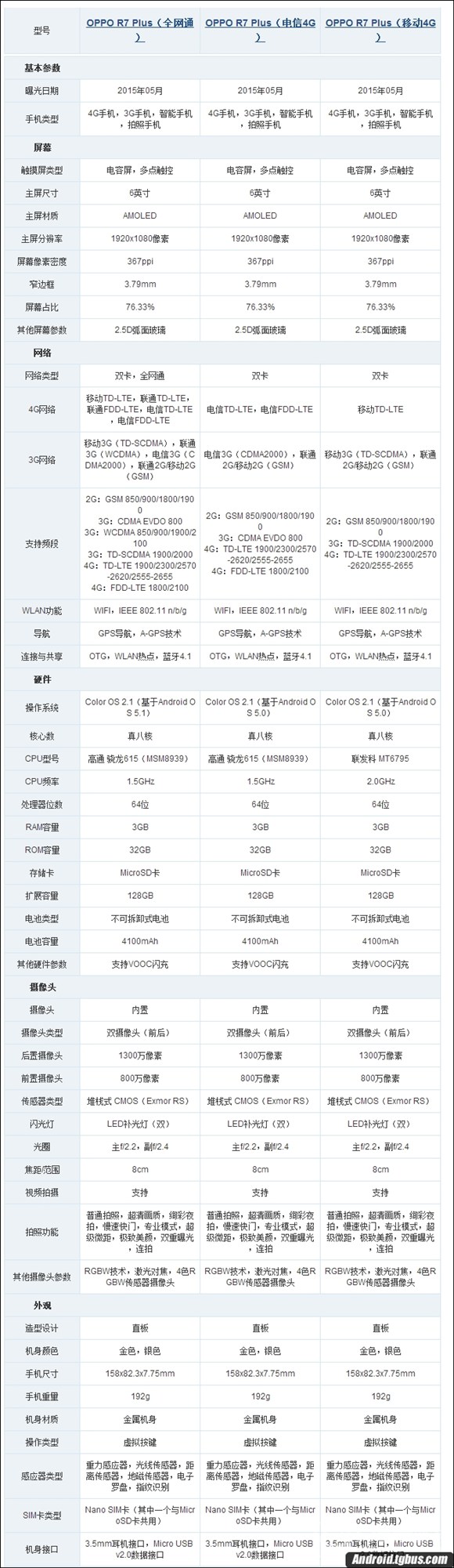 為了能讓大家更加一目了然的比較出OPPO R7 Plus全網通與移動版有什麼區別,我們先通過一張對比圖就能看出。