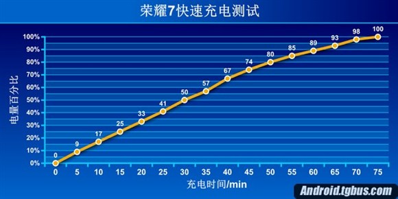 榮耀7支持9V-2A高壓的快速充電技術,官方宣稱充電5分鐘便可連續通話1小時,30分鐘可充滿50%。在這裡要說明的是,只有全網通版本的榮耀7才配有9V-2A輸出的充電器,其它版本的榮耀7只配送5V-2A的充電器。