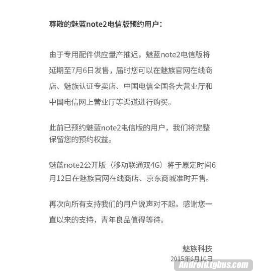 由於配件供應產能有限,魅藍note2電信版將推遲到7月6日發售。而魅藍note2公開版即(移動、聯通版)並不受影響,於原定時間6月12日在京東商城及魅族官網在線商店開售。