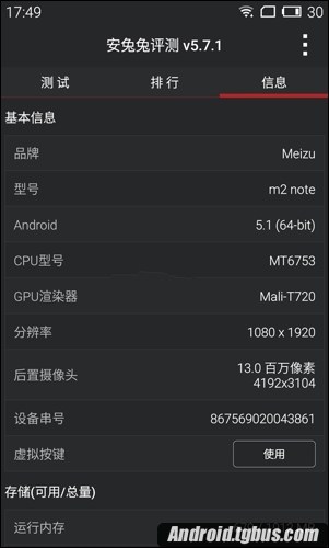 首先我們來了解下該機的配置情況,魅藍Note2搭載了64位聯發科MT6753八核處理器,64位處理器的手機;采用了5.5 英寸1080P全高清屏幕,配備了2GB運行內存,16GB/32GB兩種容量版本,16GB版售價為799元,32GB版售價為999元,標配3100mAh大容量電池,配備後置1300萬像素鏡頭,雙色溫LED閃光燈和前置500萬攝像頭,擁有f/2.0大光圈,同樣支持1080P高清攝錄;支持真雙卡雙待,。運行最新的Flyme 4.5系統,提供灰、藍、白、粉四種顏色。我們再來看看安兔兔測試帶來的詳細情況,如下圖所示: